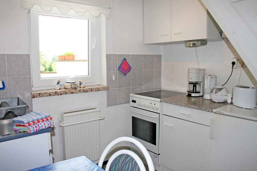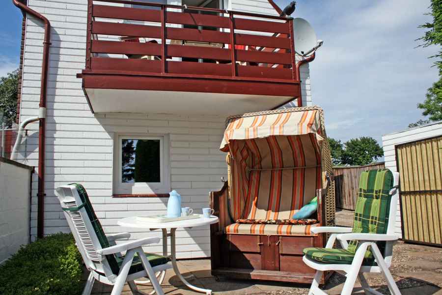 Auf zwei Ebenen können zwei Personen einen erholsamen Urlaub verbringen. Auf der Terrasse stehen für Sie ein Strandkorb sowie Gartenmöbel und Sonnenschirm bereit.